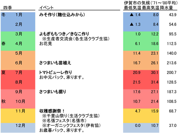 12月開催。一年の収穫を祝い、受け手の皆さんとの交流を深める一大イベント。毎年12月第1土曜 10:00~15:00。場所は畑。参加は自由。まずは、農作業体験として、種まき・いも掘り・鶏の解体など、土と命に触れる企画から。伊賀有機農産の食材を使ったおでん、トン汁、お餅のほか、みなさんのご協力で焼き鳥・カレーライス・やきそば・おにぎりなどが振る舞われます。会場では、竹細工・リース作り・しめ縄などの、自然のものでなんでも作ってみよう!工芸挑戦コーナーも。メインステージでは、音楽演奏・舞踏の披露、綱引き大会などのイベントで会場を盛り上げます。大いに食べ、語らい、農と大地を感じるひとときにしましょう。